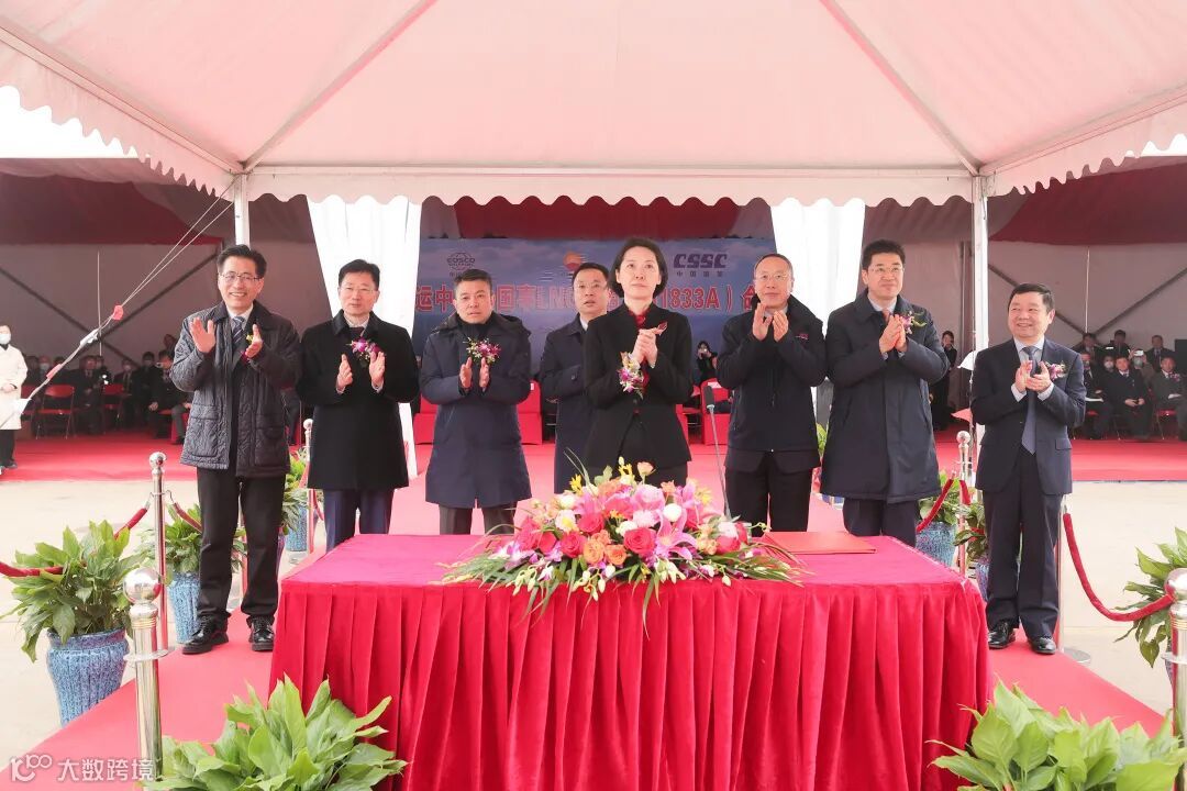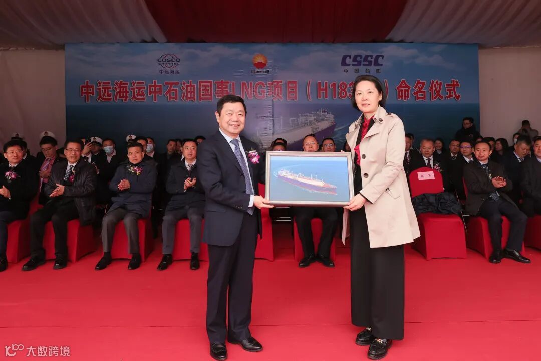 命名嘉宾刘红女士为新船砍缆敲香槟。中国船舶集团党组成员、副总经理盛纪纲,中国石油天然气股份有限公司副总裁、总工程师杨继钢,中国石油国际事业有限公司执行董事、党委书记武军利,中国石油国际事业有限公司党委委员、副总经理 王海燕,中国远洋海运集团有限公司副总经理冯波,中远海运能源运输股份有限公司董事长、党委书记任永强,中远海运能源运输股份有限公司董事、总经理朱迈进,劳氏船级社大中华区总裁薛茂根,中国船级社上海分社纪委书记、副总经理庄重,中国船舶工业贸易有限公司副总经理蔡洙一,公司党委书记、董事长陈建良、总经理陈军、副总经理翁红兵等领导出席交船仪式。公司LNG总建造师何江华主持仪式。