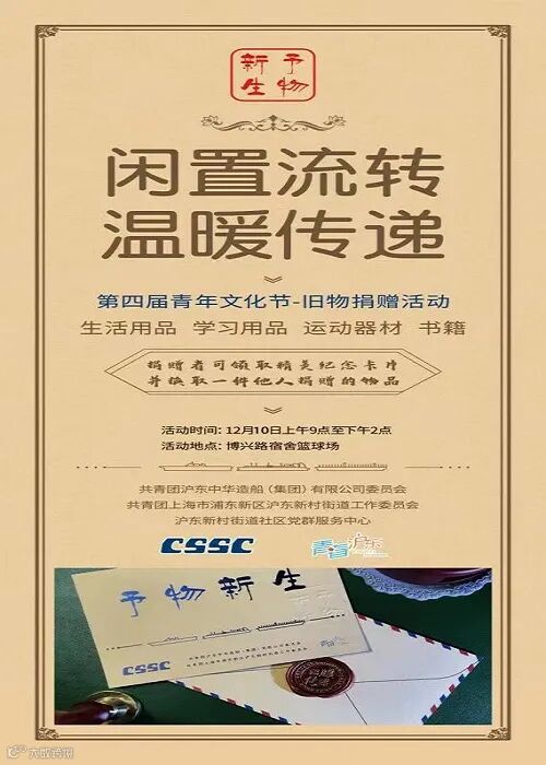 12月10日,公司团委和沪东新村街道社区党群服务中心联合主办的“予物新生”旧物捐赠活动,青年员工和家属们纷纷捐赠出家中闲置物品。活动共募集 “生活用品、学习用品、运动器材、书籍”物品245件,已全部移交沪东新村街道社区党群服务中心派发给街道对口帮扶群体。