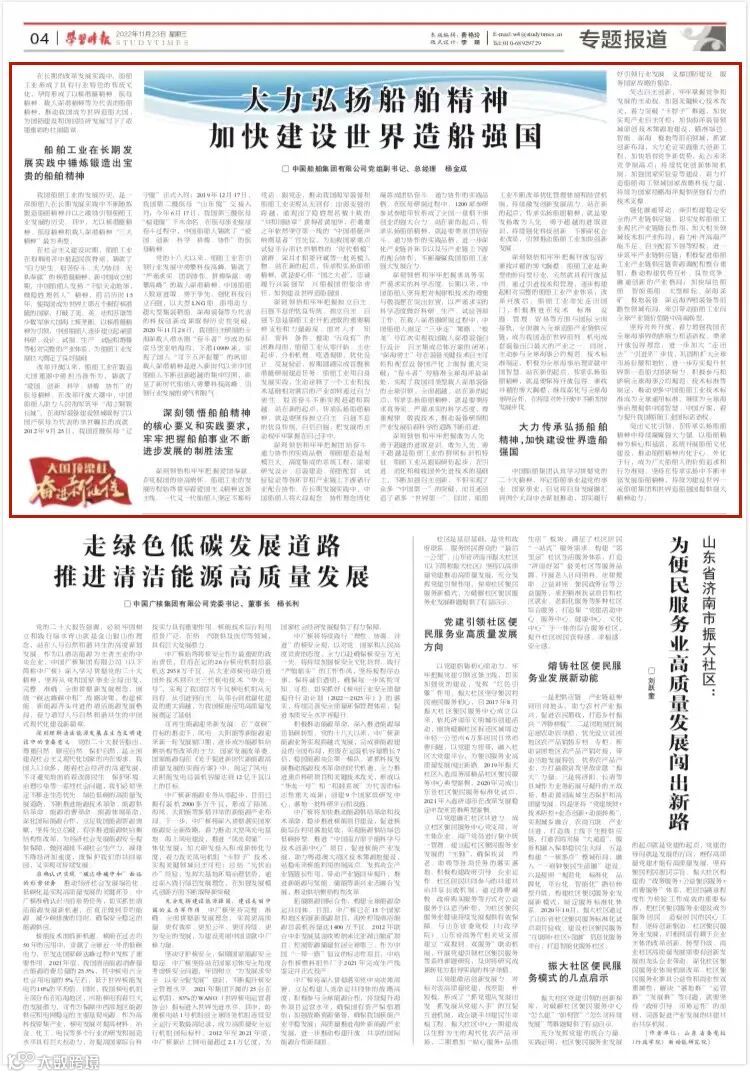 中国船舶集团认真学习贯彻党的二十大精神,牢记船舶事业是党的事业、国家事业,自觉将自身发展融汇到两个大局中去谋划推动,切实履行好引领行业发展、支撑国防建设、服务国家战略的使命。