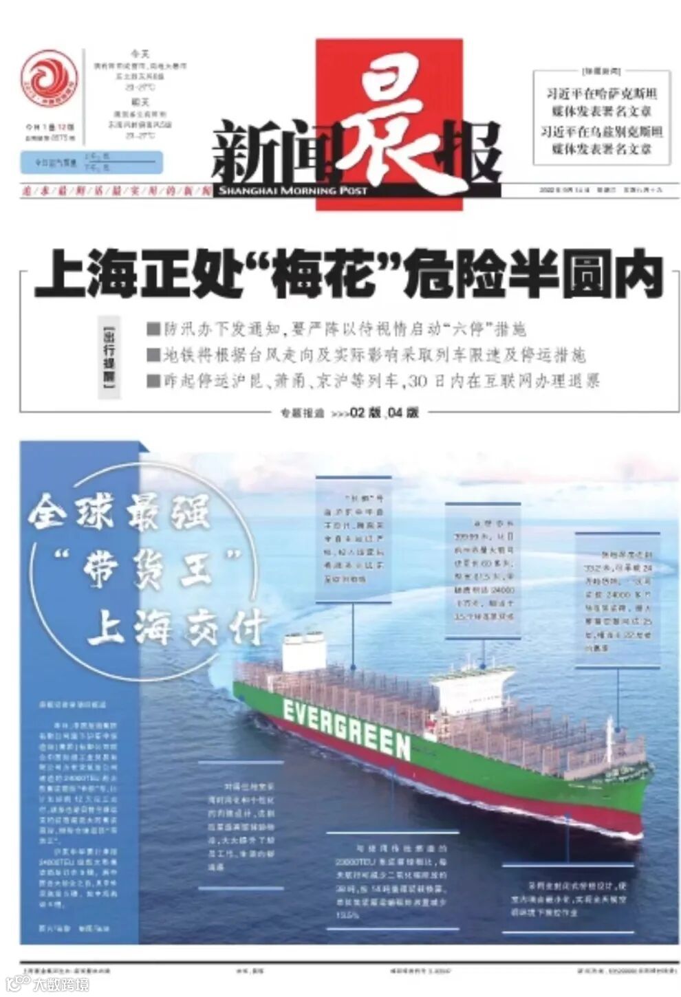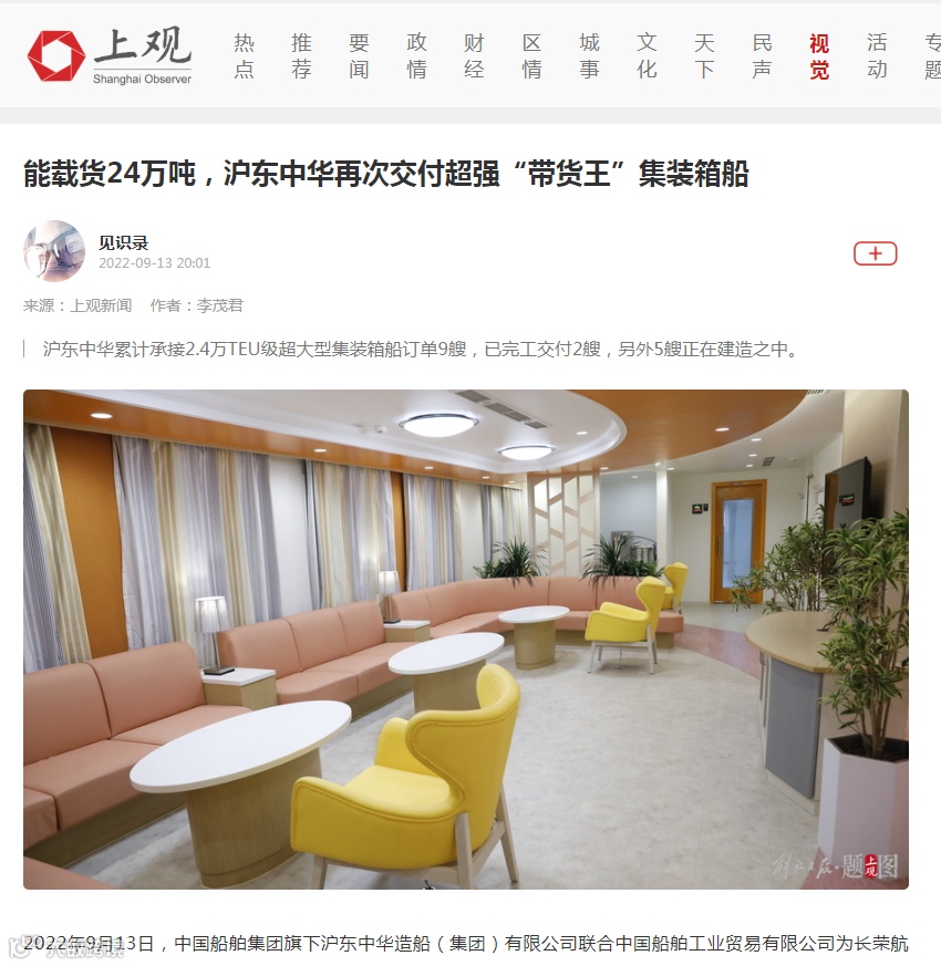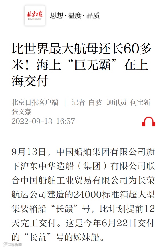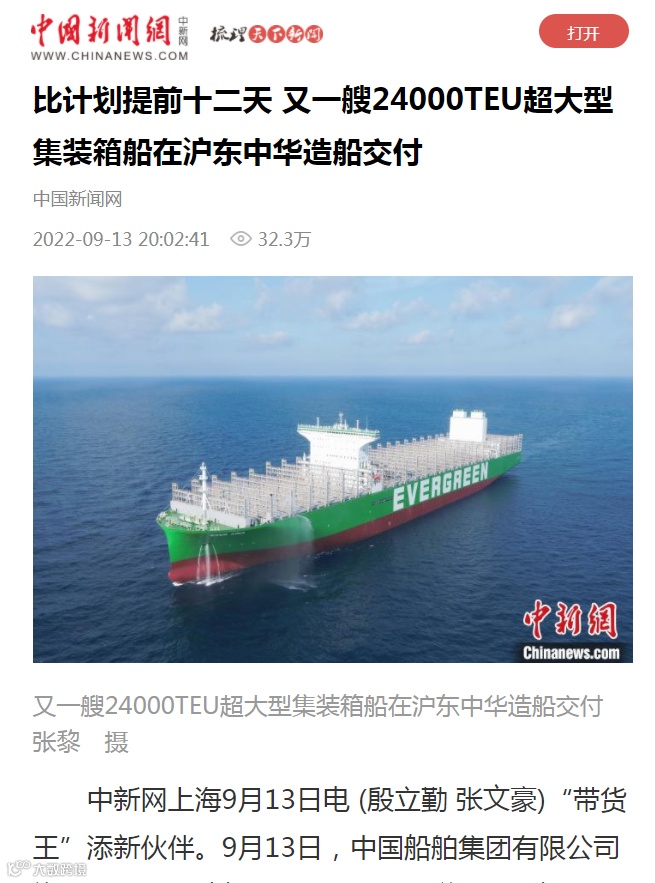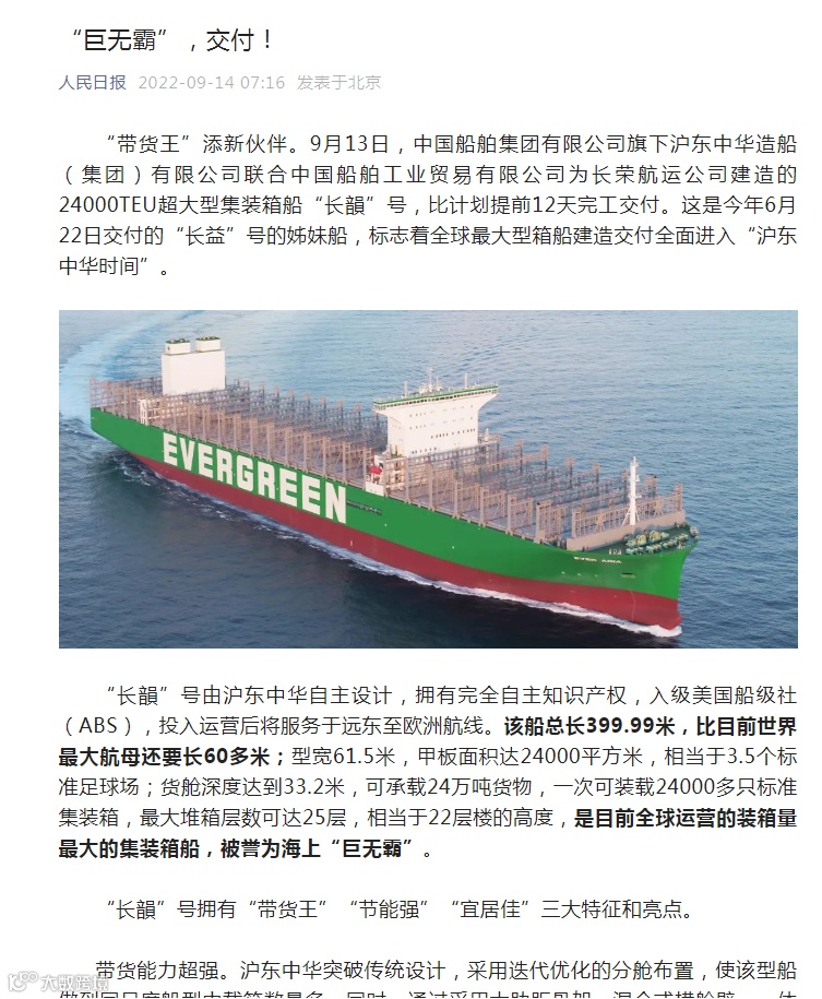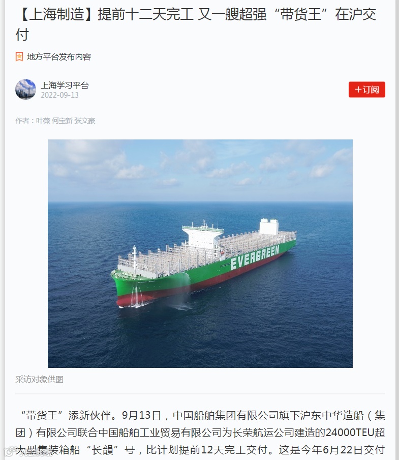 9月13日,公司建造的24000TEU级超大型集装箱船项目2号船“长韻”号提前12天,在长兴造船基地正式交付。这是今年6月22日交付的“长益”号姊妹船,是目前全球运营的装箱量最大的集装箱船,被誉为海上“巨无霸”。