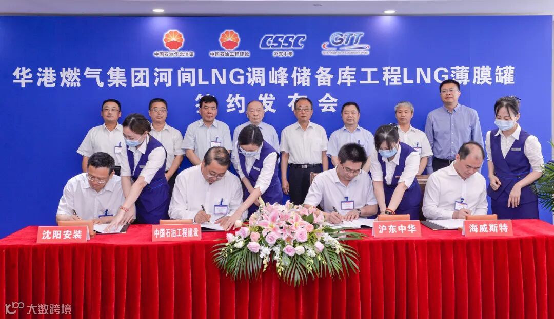 中国船舶集团有限公司旗下沪东中华LNG全产业链发展又有新突破。8月11日,中国首座陆上LNG(液化天然气)薄膜罐项目—华港燃气集团河北河间LNG调峰储备库工程签约仪式在沪东中华举行。中国石油工程建设有限公司华北分公司作为EPC总承包商与沪东中华造船(集团)有限公司和上海海威斯特保温工程有限公司、沈阳工业安装工程股份有限公司组成的联合体,以及法国GTT公司分别签署了薄膜罐施工分包合同和GST薄膜罐专利授权协议。此项目将通过五方合作完成中国首座29000m³陆上LNG薄膜型储罐的建设,将是国内能源项目合作的重大机制创新和商业模式创新,必将成为中国LNG存储装备产业发展历程中的新里程碑。来自全国各省、市、自治区30余家燃气企业、协会和法国驻上海总领事馆相关负责人共计60余人出席签约仪式。