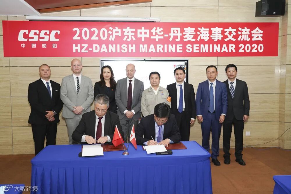 公司总经理助理兼配套部部长罗乐,丹麦海事集团副主席徐阳代表双方签署海事合作备忘录。