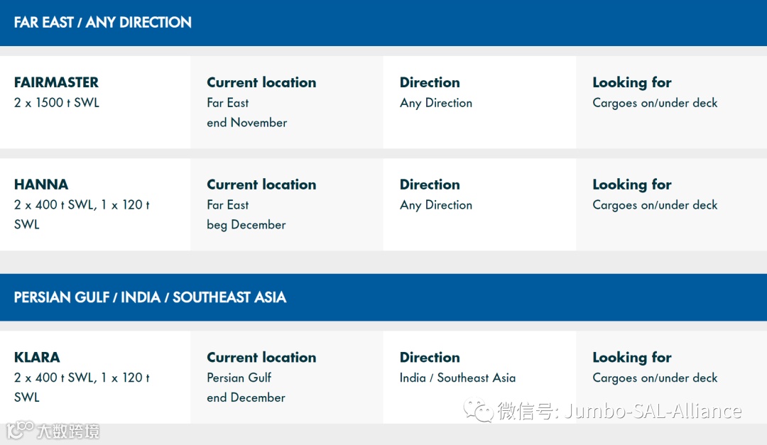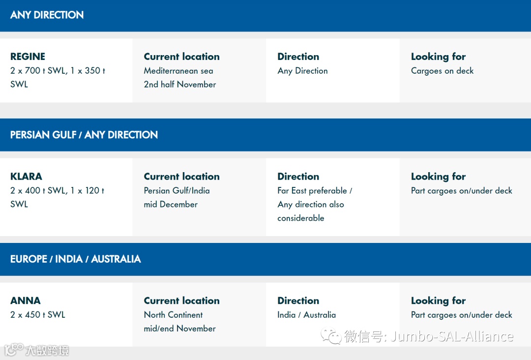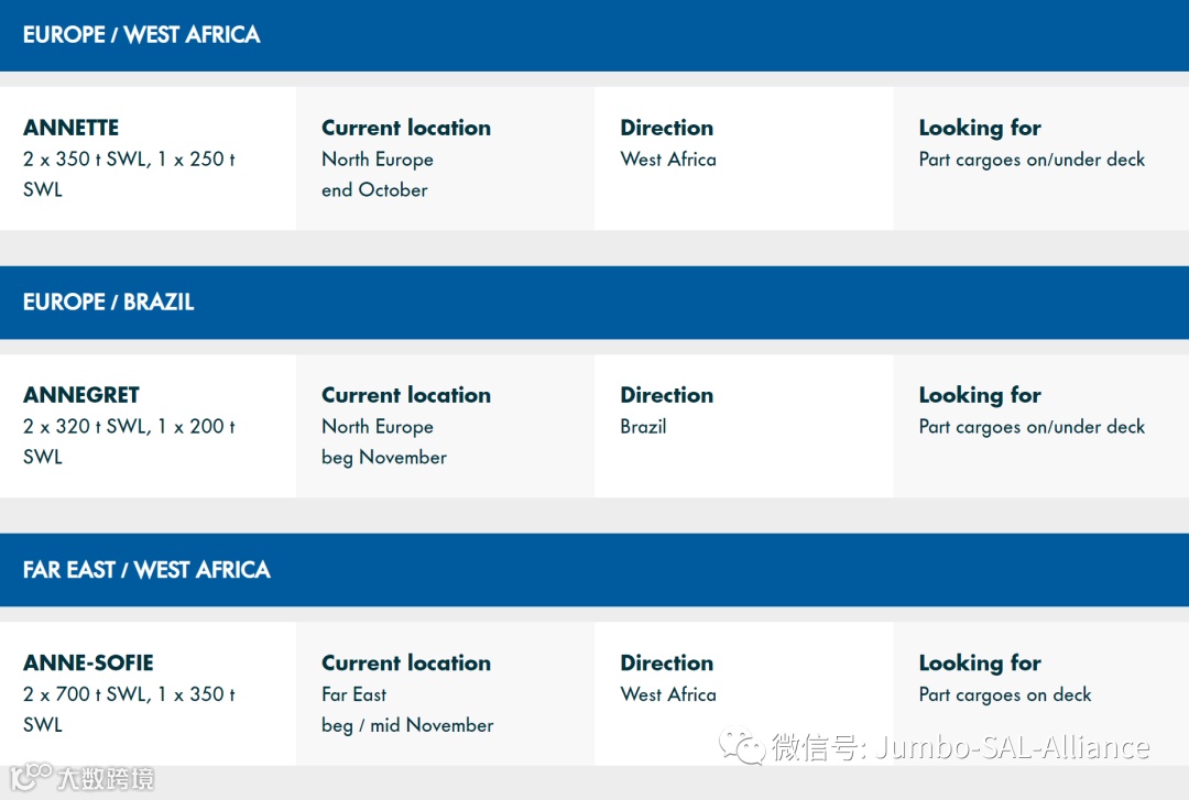 Find out where our vessels currently are and what space is still available on this week’s Jumbo-SAL-Alliance position list: