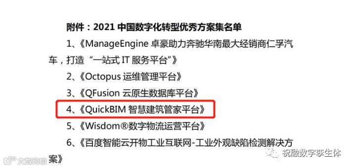 同时,祝融科技QuickBIM智慧建筑管家平台也作为行业数字化转型典范,入选《2021中国数字化转型优秀方案集》。