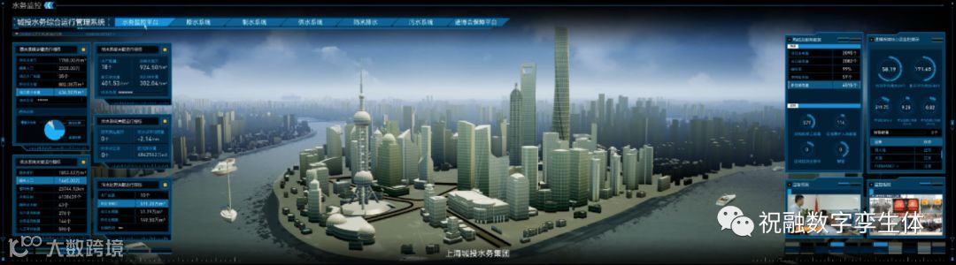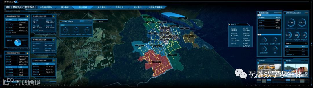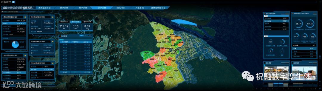 以数字孪生体的数据描述与可视化形式,全面、准确、立体、实时展示城投水务全产业链的运行情况,包括:原、制、供、排、污五大系统加应急预案、热线