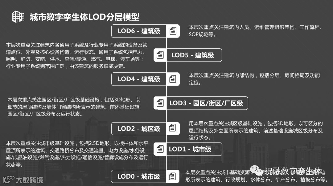 在祝融科技提出的城市数字孪生体LOD分层模型意见稿中,LOD1、LOD2关注的是城市级/城区级基础设施,包括基础地形、建筑概况、交通、电力、水务、成品油、燃气、热力、通信、管廊等相关基础设施的分布与实时状态。其中,城市水务管理正是“LOD1-城市级”、“LOD2-城区级”所重点关注的。