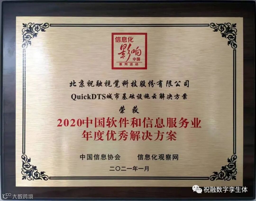 业年度风云榜”评选结果正式公布。祝融科技QuickDTS城市基础设施云解决方案被评为“2020中国软件和信息服务业年度优秀解决方案”。