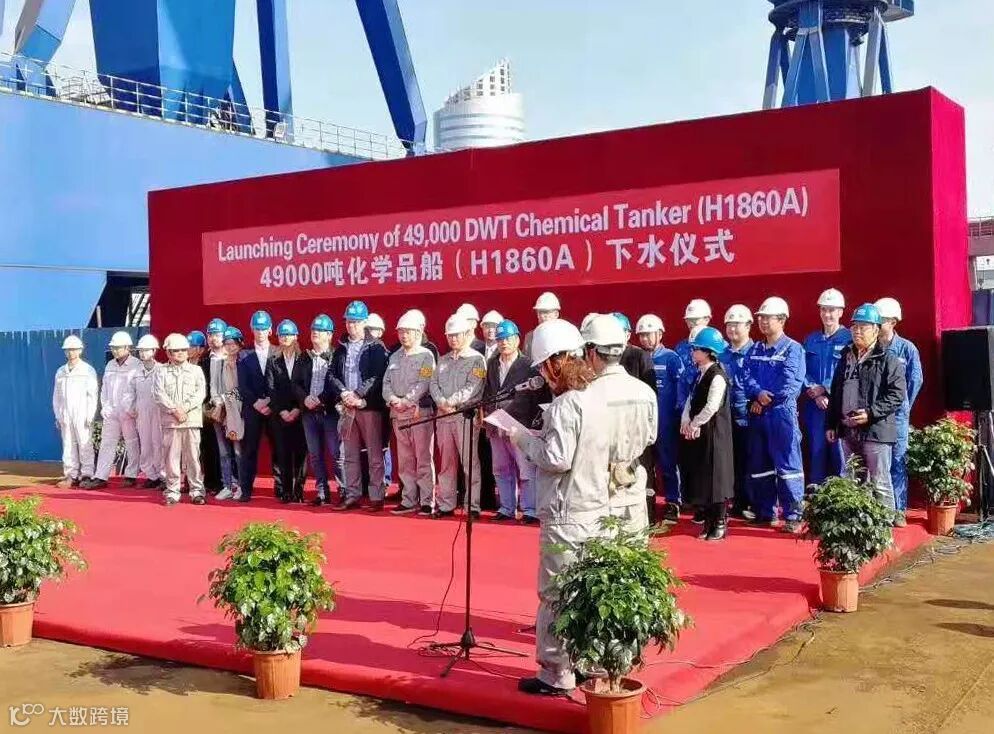 11月23日下午,喜庆的汽笛声中,世界最新型49000吨双相不锈钢化学品首船在沪东中华顺利下水。这艘融合全球众多领先技术于一身的顶级化学品船拥吻黄浦江水,代表着沪东中华建造实力又迈上了新台阶。