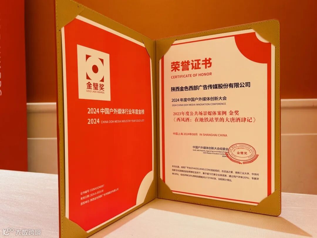 第六届金璧奖·中国户外媒体创新大会于上海召开,陕西金色西部广告传媒股份有限公司【西凤酒:地铁站里的大唐酒肆记】案例荣获2023年度公共场景媒体案例金奖。