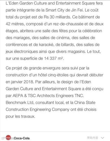 据悉,伊甸园文化娱乐休闲广场项目占地28713平方米,建筑面积为14337平方米,由北京清水爱派建筑设计股份有限公司著名设计师杨铮设计,并荣获2016人居生态国际建筑规划设计方案竞赛建筑金奖。该项目由中国建筑第八工程局有限公司毛里求斯分公司承建,核工业第七研究设计院建设监理公司进行工程监理,采用独立基础及钢筋混凝土框架结构,于2016年9月开工建设,预计2018年8月投入使用。建筑为地上三层,一二层主要用于KTV、电影院、保龄球、游戏厅、婚纱摄影、购物及纪念品商店等商业及娱乐设施;三层为空间钢结构造型,高度38m,目前已与法国Gao’s gallery 公司达成意向,主要作为AEA艺术博物馆、婚礼殿堂。