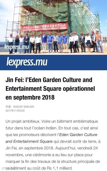 毛里求斯国家电视台、快报、毛人报、网络媒体等毛里求斯十几家主要媒体记者见证并进行了报道。伊甸园文化娱乐广场的成功封顶,标志着晋非经贸合作区发展进入快车道,以中国设计、中国建设、中国速度,更加坚定了毛国政府及人民对晋非建成高标准智慧城市的信心。