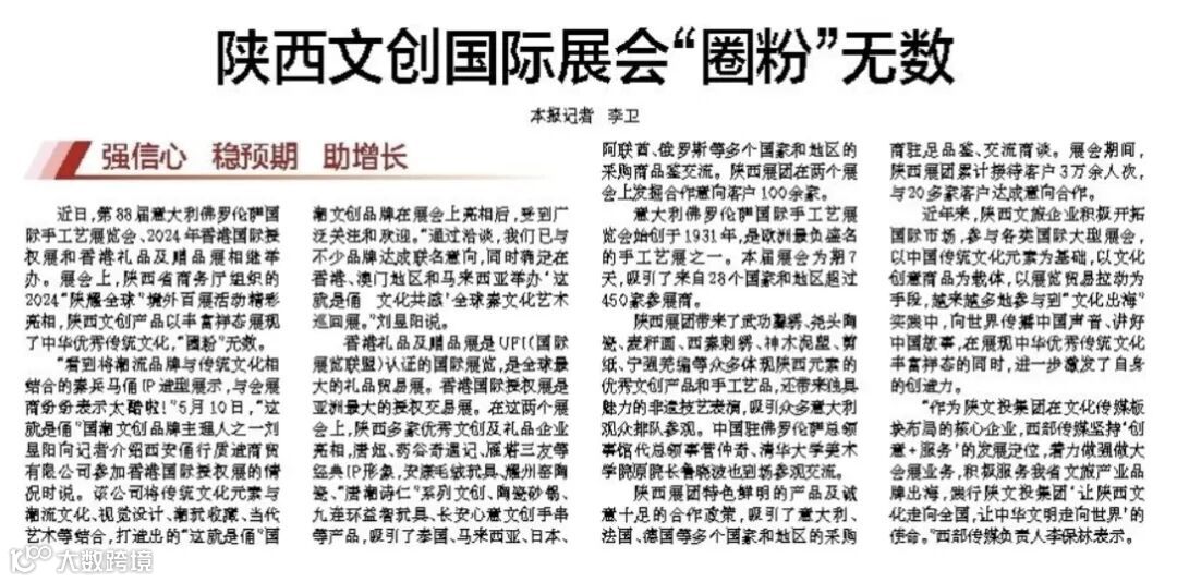 近日,第88届意大利佛罗伦萨国际手工艺展览会、2024年香港国际授权展和香港礼品及赠品展相继举办。展会上,陕西省商务厅组织的2024“陕耀全球”境外百展活动精彩亮相,陕西文创产品以丰富样态展现了中华优秀传统文化,“圈粉”无数。