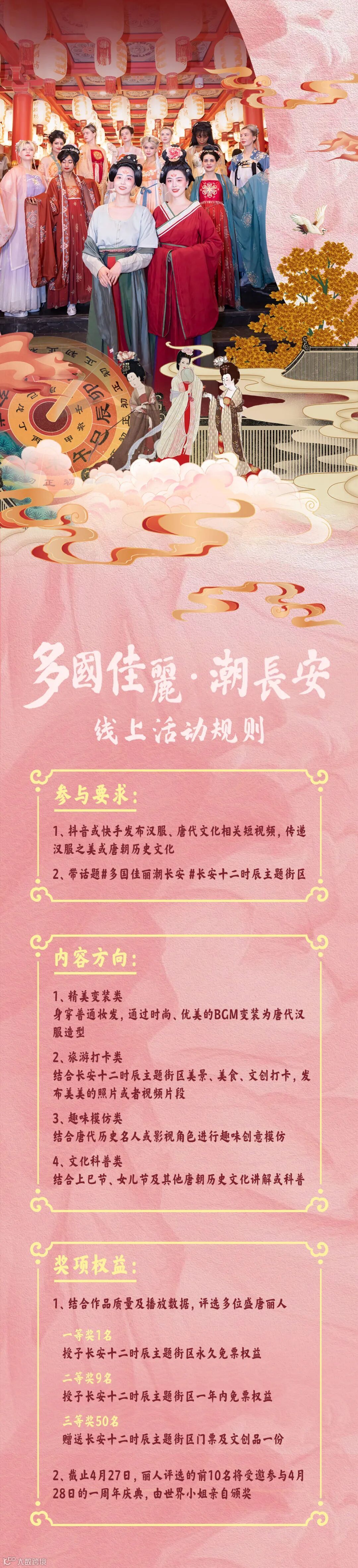 参与线上话题活动,就有机会获得官方流量扶持,向更多人展现你的风采!优秀作品还可获得长安十二时辰主题街区终身免票名额奖励,更有精美文创礼品等多重好礼相送,快来和我们一起向世界传递中华文化,传递汉服之美吧!活动参与指南这就奉上!