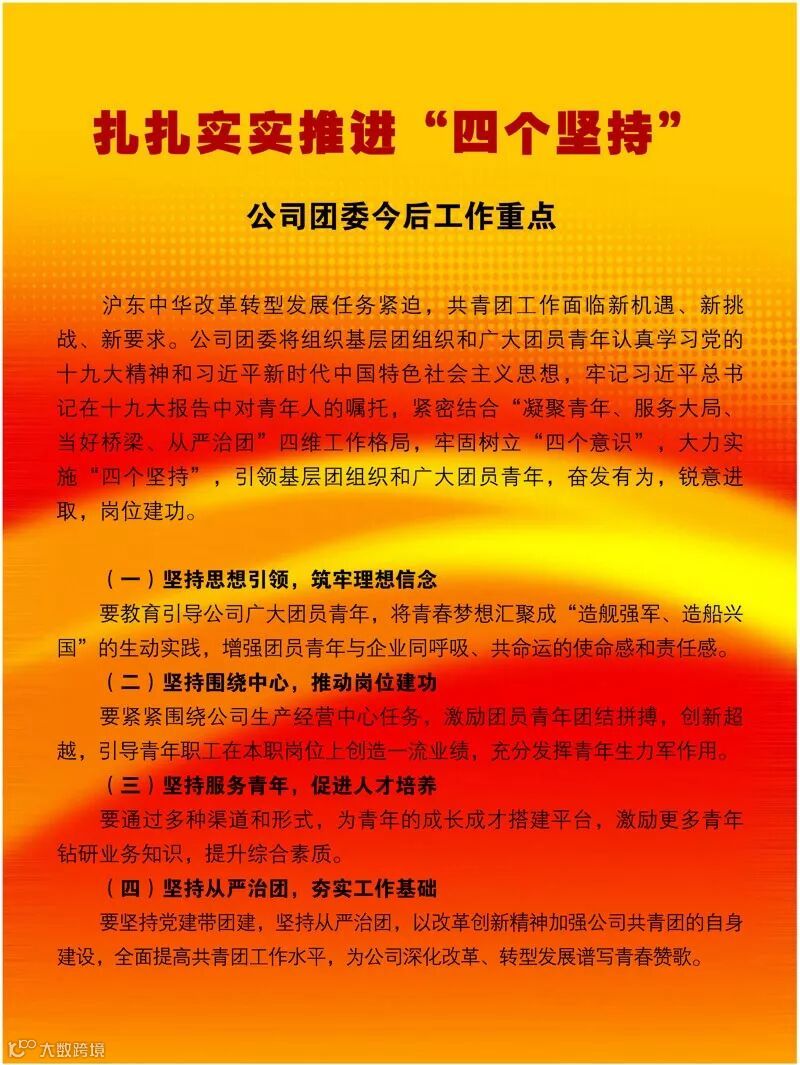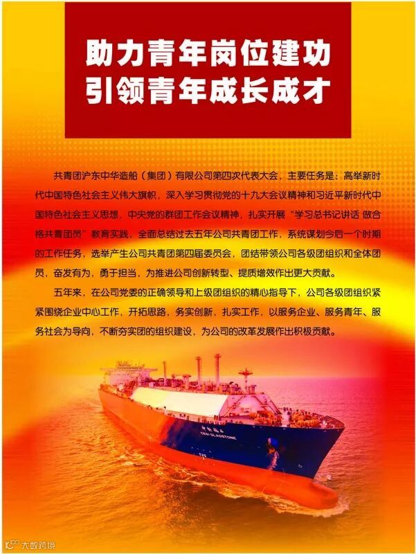 公司团委书记《助力青年岗位建功,引领青年成长成才,为公司创新转型发展奉献青春》工作报告,回顾总结了过去五年公司团委的各项工作,明确了未来几年公司共青团工作的目标和任务。大会112名团代表通过差额选举产生了公司第四届团委会委员。会议通过了《共青团沪东中华造船(集团)有限公司第四次代表大会决议》。