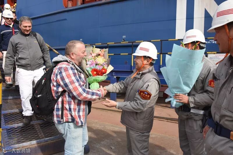 1月13日,第2艘13000吨重吊船完成了3天试航任务。公司总经理陈军在码头为船东船检献花。