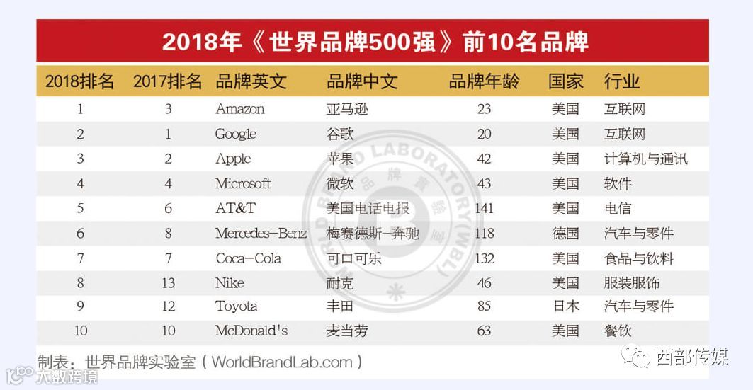 世界品牌500强评出的全球前十大品牌分别为亚马逊、谷歌、苹果、微软、AT&T、奔驰、可口可乐、耐克、丰田和麦当劳。其中,美国品牌占了9个,日本品牌1个。
