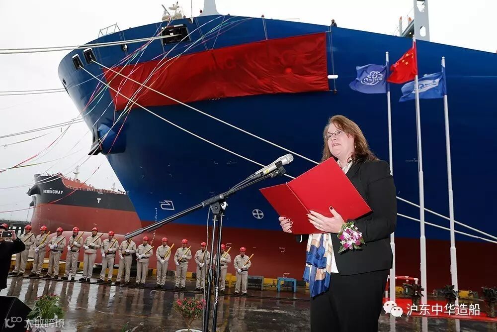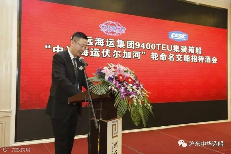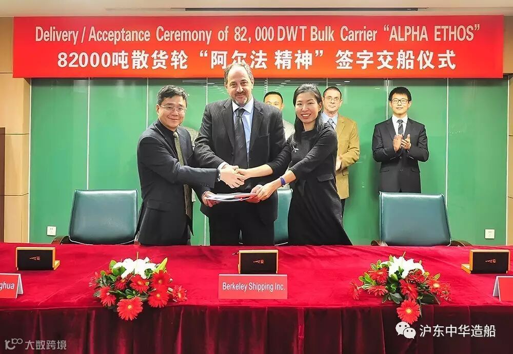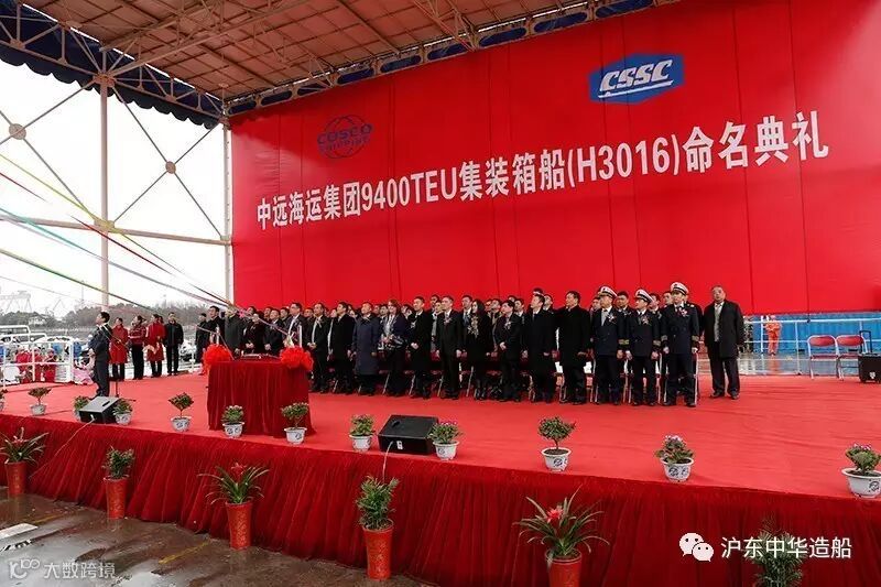 中远海运集装箱运输有限公司副总经理朱建东、中国船舶工业贸易公司业务五部副总经理阳宇和沪东中华常务副总经理、长兴造船公司总经理黄一平共同签署了交船文本。