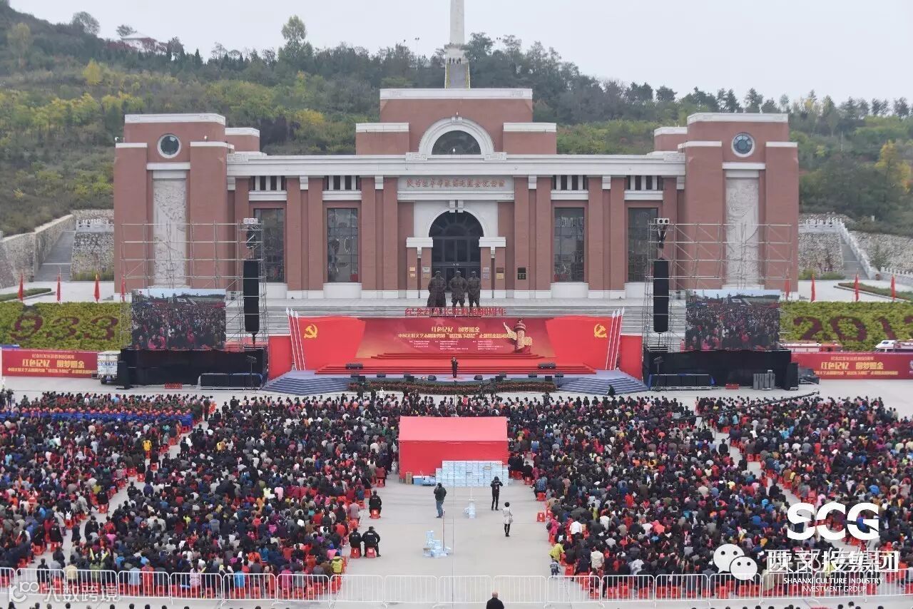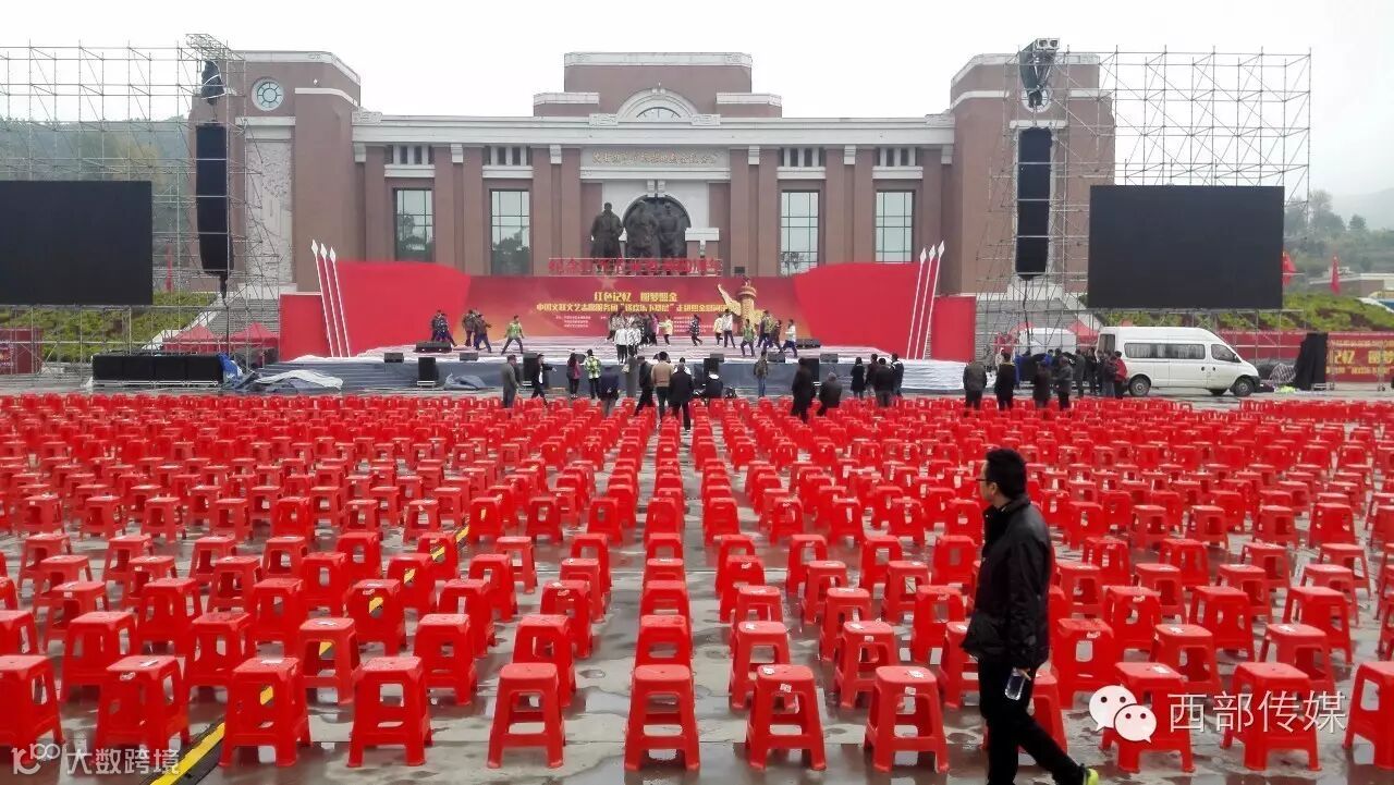 本次活动以场内主舞台的策划设计、场地周边的氛围营造为主要服务内容,紧紧围绕“红色记忆圆梦照金”的活动主题展开。场内,舞台依陕甘边照金革命根据地纪念馆拔地而起,以刘志丹、谢子长、习仲勋三位革命家雕像为中心展开,飘扬的三面大旗象征着长征精神的不断延续,场下数千把红色座椅和着一排排挥动的国旗党旗,将现场汇成一片热闹的红色海洋。