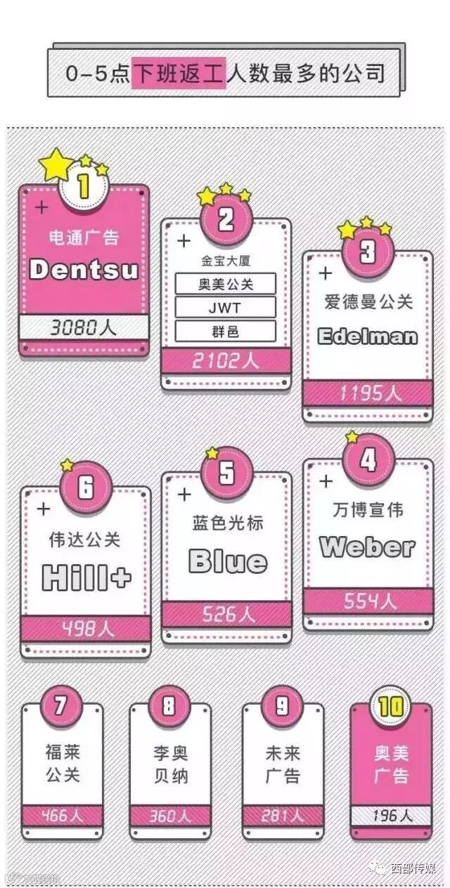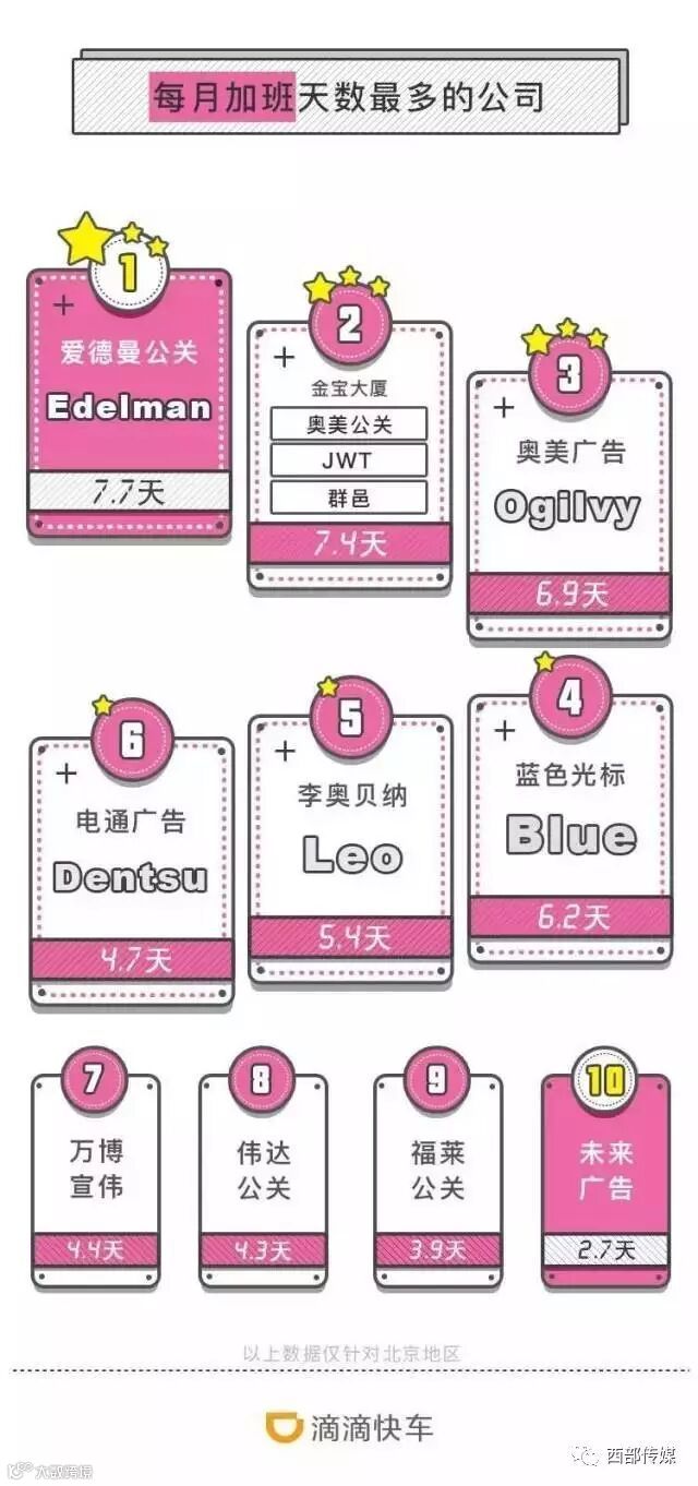 最近,滴滴发布了加班大数据,从下班时间最晚、周末加班最多、0-5点下班返工最多以及每月加班最多四个方面,对2016年最“狠”公司进行了大揭秘。