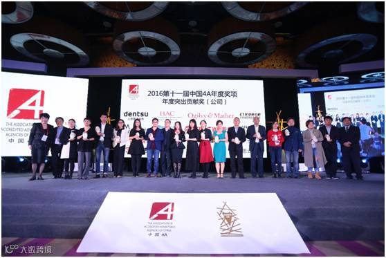 另外,北京电通广告有限公司、北京广告有限公司、奥美整合行销传播集团、麦肯·光明广告有限公司、中视金桥国际传媒集团、广东省广告集团股份有限公司、分众传媒(中国)控股有限公司、北京蓝色光标品牌管理顾问股份有限公司、阳狮广告有限公司、吉广国际广告股份有限公司、北京全景视觉网络科技股份有限公司、琥之珀文化传播(上海)有限公司、群邑(上海)广告有限公司、凯络中国、思美传媒股份有限公司、北京新意互动广告有限公司、灵思云途,荣获中国4A年度突出贡献公司奖。