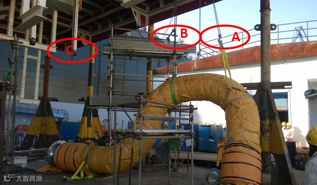 2014年12月5日下午3点,一组工人使用1个3吨葫芦(C),2个2吨葫芦(A, B)安装一根1.78吨的管子,突然第三个葫芦(C) 的钩头失效,管子滑落。受到载荷冲击以后,由于其他葫芦的承载,这根管子悬于空中。然而,如果其它的一个或两个葫芦失效,这根管子将向侧面倾倒。由于工人在危险区域外面,没有人受到伤害。
