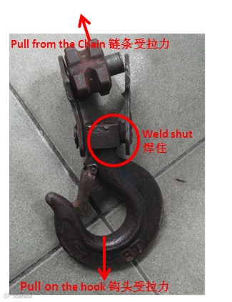 钩子转轴被焊住(自己修改),所以当钩头受到扭力时,钩头不能按照原先设计的方式自由旋转,扭力导致销子从葫芦的侧面脱出。
