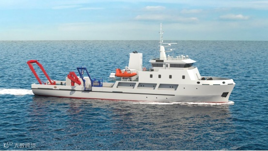 专用工作船总长49.6米,型宽9.0米,型深4.3米,设计排水量约600吨,航速18节。采用双机、双可调桨推进,设艏侧推及尾侧推,具备DP-1动力定位能力,配备甲板作业支持系统设备、搭载水下测量基阵精确布放系统专业收放设备。主要作业海域位于大连市附近海域,能够搭载专用布放、回收及打捞设备,满足测试系统布放回收、日常运维、试验期间安全警戒及试验人员设备的运送任务等。