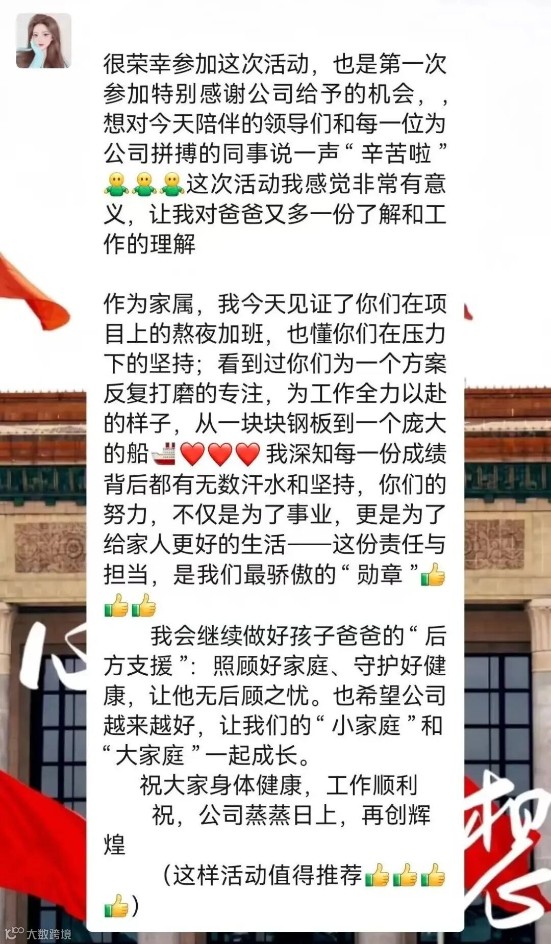 此次职工家属开放日,不仅是一次企业风貌与企业精神的真诚展示,也是一次“小家”与“大家”的情感共鸣。当家属的理解融入职工奋斗的日常,当家庭的温暖汇入国家制造的血脉,那份深沉的责任与担当便在彼此守望中愈发闪亮。我们相信,这份来自后方的坚定支持,将成为武昌造船在新时代破浪前行、书写辉煌的深厚底气与不竭动力。