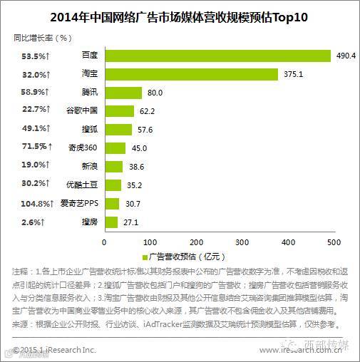 根据艾瑞咨询集团对企业广告营收最新预估数据,2014年,百度广告营收超过490亿元,同比增长为53.5%,位居第一。淘宝广告营收超过375亿元,位居第二。百度与淘宝广告营收占整体网络广告市场营收比重达56.2%,是中国网络广告市场的中坚力量。