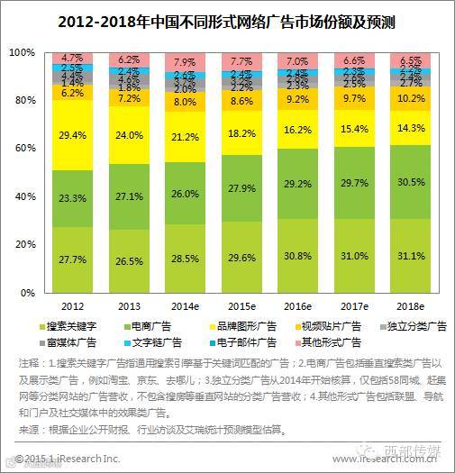 2014年,根据艾瑞咨询集团发布网络广告市场数据,在新的划分口径下,中国网络广告市场中占比最大的为搜索关键字广告(不含联盟),达到28.5%,较2013年上升2个百分点。份额排名第二的广告形式为电商广告,占比为26.0%,较去年小幅下降。品牌图形广告份额位居第三,占比为21.2%。