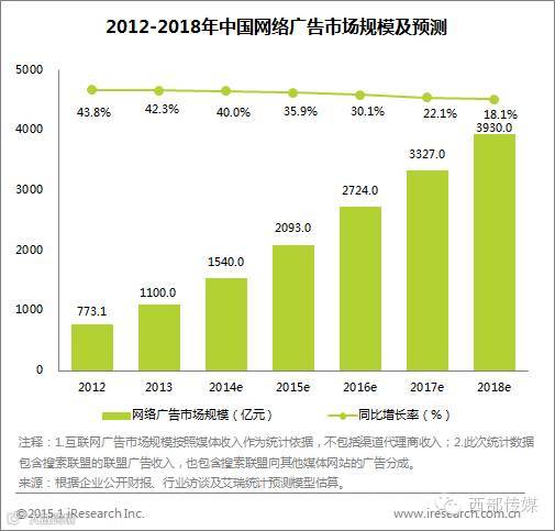 2014年中国网络广告市场规模达到1540亿元,同比增长达到40.0%,增速较去年小幅下降。在网络广告市场整体进入成熟稳定阶段之后,市场仍然呈现出一些新的发展态势。各个网络媒体细分领域表现各异,一些传统领域呈现出成熟态势下的增速放缓,一些领域在新的广告技术与广告形式共同驱动下,迸发出强劲的增长势头。与此同时,品牌广告主预算进一步向数字媒体倾斜,均推动网络广告市场规模达到新的高度。