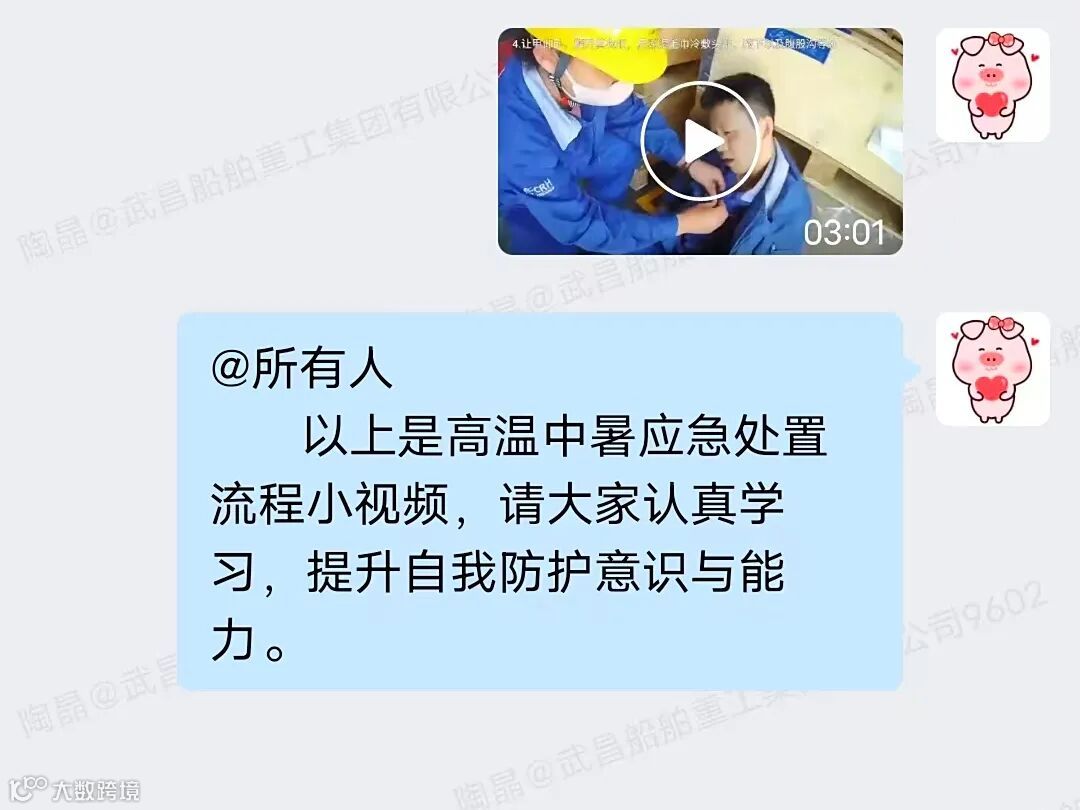 公司各部门通过多种形式开展防暑降温培训,提升员工自我保护意识和应急处置能力。保障部通过企业微信推送高温中暑应急处置流程小视频,普及中暑症状识别、应急处置方法及科学饮水、健康作息等知识;分段部、南通顺融开展中暑症状识别和现场急救专项培训;重工公司开展食物中毒、高温中暑、防触电应急演练、消防演练、有限空间窒息等应急演练。