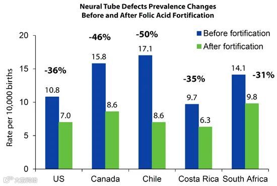 全球每年有30万神经管闭锁障碍患儿,据疾控中心评估,仅通过补充叶酸就可以避免至少一半的病例。相应的,美国农业部要求所有的谷物加工食品内必须要添加叶酸,例如面包,意大利面等。