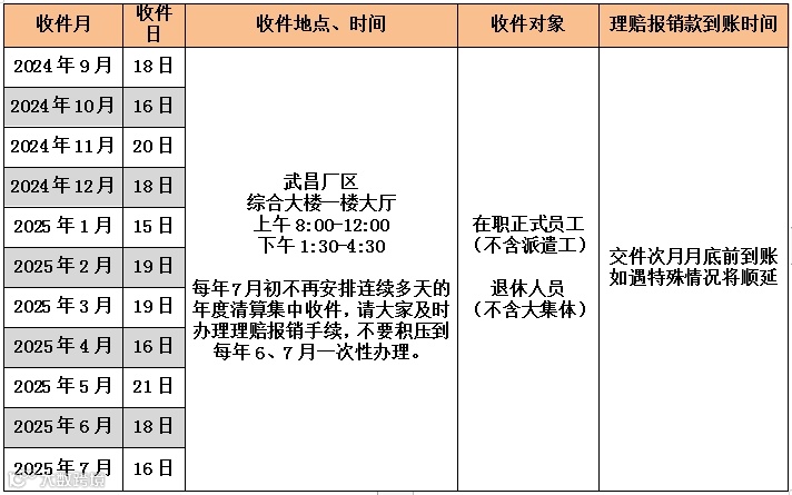 因武昌厂区综合大楼整体装修,无法在每年7月初安排连续多天的年度清算集中收件,2024-2025年度补充医疗保险武昌厂区改为每个月第三个星期三收件,请大家逐月及时办理理赔报销手续,不要积压到每年6、7月一次性办理。