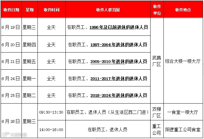 2、请准备在武昌厂区交报销的退休人员,按照各自退休年份的对应收件日期前往,进入收件现场前要查验退休证原件核实退休年份,对不在当天收件人群范围的恕不接待。