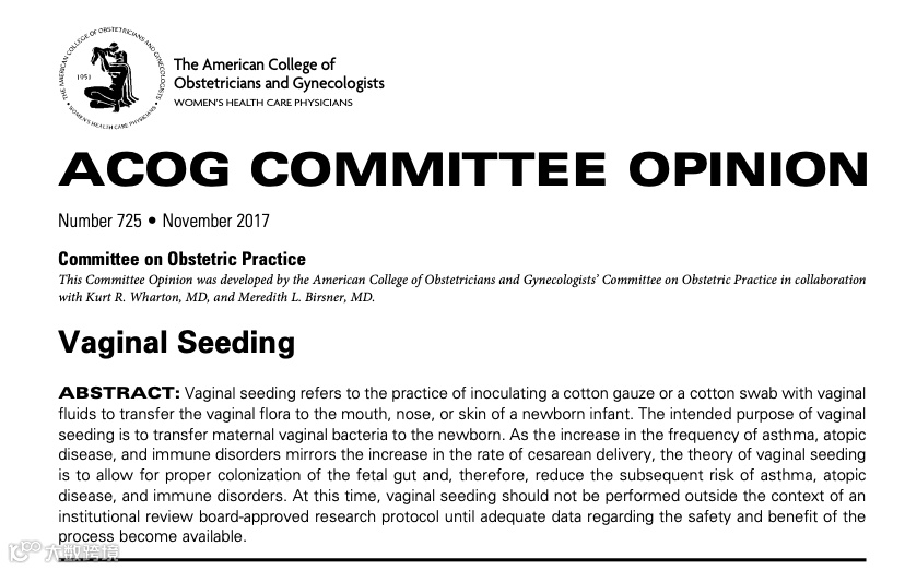 美国曾经有医疗机构在刨腹产时将卫生纱布置于产妇阴道内,孩子出生后立即用此纱布为新生儿做全身擦拭,包括眼睛和口腔。这个目的也是为了模仿阴道产的过程,给刨腹产的新生儿接种母亲的阴道菌群。美国妇产科医生协会于2017年已经明确建议医生不要为产妇和新生儿做相应操作,因为这有可能会引发危险的感染。产妇自身的阴道菌群也与产妇孕期荷尔蒙的分泌水平有关系。分娩后,其阴道菌群也会随之荷尔蒙水平的消退而发生变化。新生儿自身不分泌产妇水平的荷尔蒙,这些接种的菌群自然也难以维持。