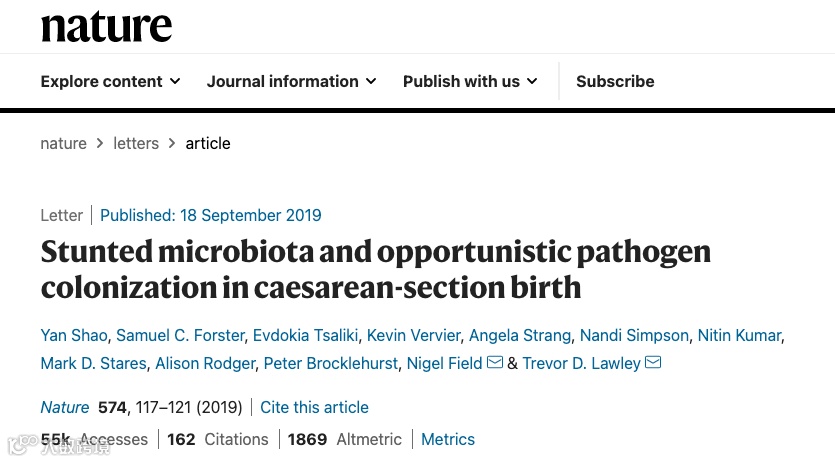 2019年《自然》杂志的一篇论文通过微生物基因组的定量测序技术分析了通过阴道产或者通过刨腹产出生的婴儿的肠道菌群,不同分娩方式出生的婴儿在生命的早期几十天内会有不同的肠道菌落组成。阴道产婴儿的肠道菌群组合更加接近母亲的肠道菌群而不是母亲的阴道菌群;刨腹产的菌群更加接近婴儿所处分娩环境中的菌群。