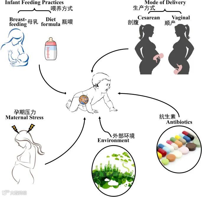 剖腹产前后的抗生素服用,以及产后开奶较晚对于新生儿肠道菌群也有影响。剖腹出生的新生儿随母亲在医院停留时间相对较长,与医护人员接触相对较多,与母亲接触相对较少也是客观因素。越来越多医院建议母婴同房,多进行皮肤接触,尽早进入母乳喂养,甚至在新生儿洗浴的时间和频率上进行优化,这些措施也都对新生儿体内菌群组成产生调控。
