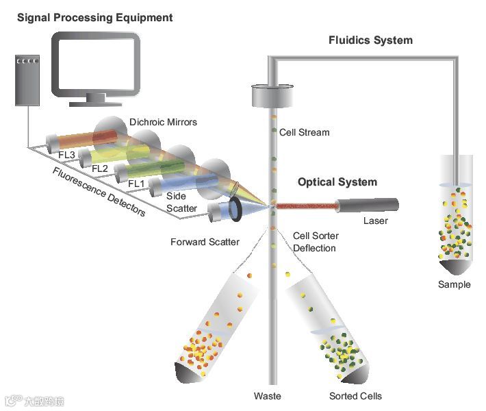 因为含X染色体的精子里的DNA总量比含Y染色体的多2.8%,所以用特定染色剂(Hoechst 33343)染色后,再用紫外线照射后含X染色体的精子能释放出更多的荧光,所以可以用配有紫外激光的流式细胞仪进行分离。