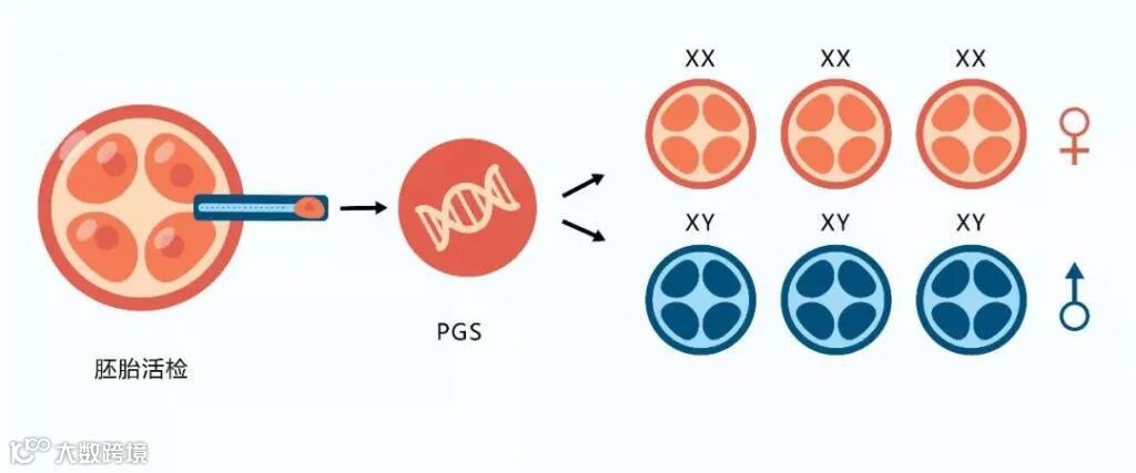 试管婴儿技术结合移植前基因筛查(PGS ,或PGT-A)可以在胚胎还在培养皿阶段(受精5-7天)应用显微操作提取3-5个细胞做检查。人体23对染色体中任何一对有单体或三体的情况都可以提前发现,从而避免移植相应的胚胎导致流产或者生育患有先天性疾病的可能性。检查染色体的对数自然的可以分辨出是一对X染色体还是一个X加一个Y。PGS的检测准确率在99%以上。
