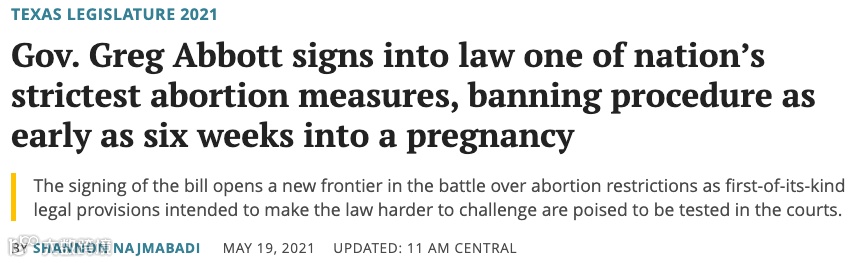 最新的例子是德州(Texas)州长刚刚签署法律,禁止在可以检测到胎儿心跳后坠胎,所以这个立法的别名也叫心跳法。