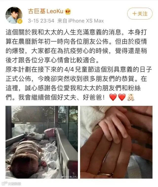 昨天晚上,古巨基通过微博宣布已升级当爸。