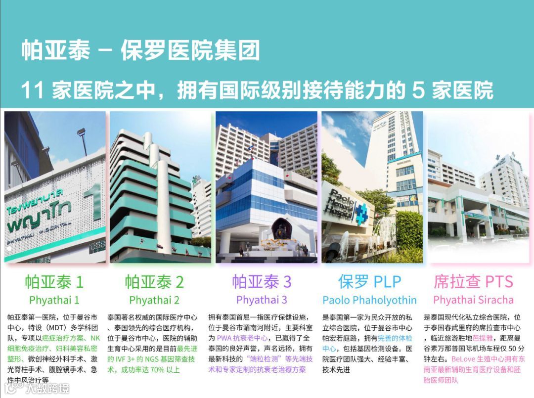帕亚泰 - 保罗医院集团是泰国曼谷杜斯特医疗服务集团(BDMS)旗下 6 大医院品牌之中,规模最大的医院集团。自 1987 年,正式成立至今,帕亚泰-保罗医院集团,在泰国有 11 家私立综合医院,帕亚泰 1 医院、帕亚泰2 国际医院、帕亚泰 3 医院、席拉查医院、保罗医院集团等… 旗下医院,多获得国际医疗卫生机构认证联合委员会(JCI)认证 。是泰国最高水平的医院集团之一。