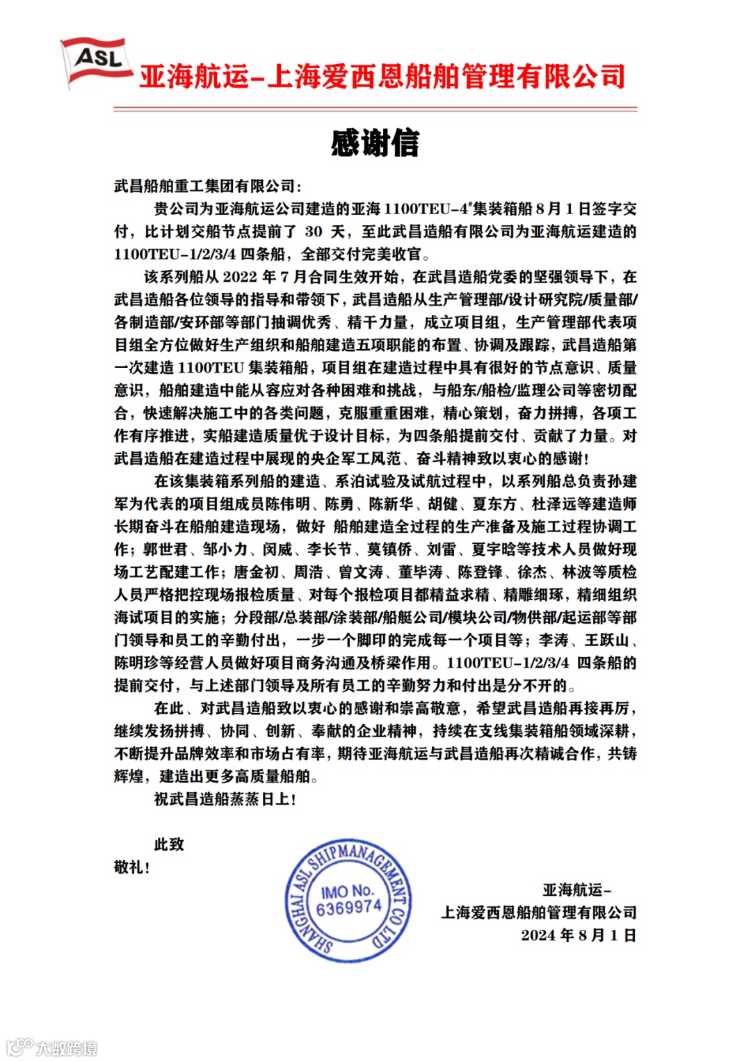 4 艘 1100TEU 集装箱船均提前交付,这一成果充分彰显了武昌造船卓越的专业能力、高效的管理水平和强大的团队协作精神。