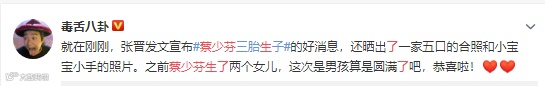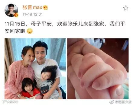 昨天,张晋又在微博宣布蔡少芬三胎生子,母子平安。网友们纷纷恭喜。