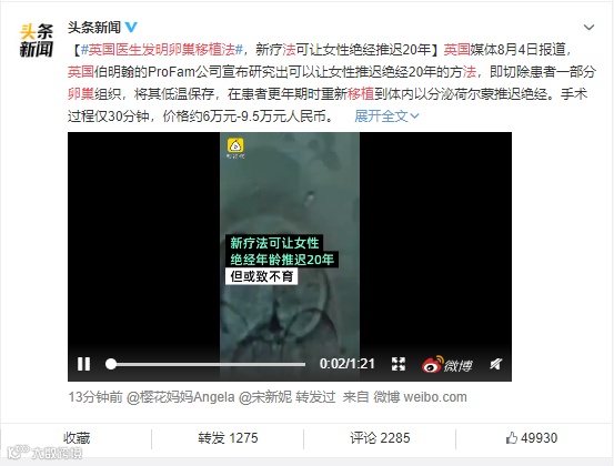 【#英国医生发明卵巢移植法#,新疗法可让女性绝经推迟20年】英国媒体8月4日报道,英国伯明翰的ProFam公司宣布研究出可以让女性推迟绝经20年的方法,即切除患者一部分卵巢组织,将其低温保存,在患者更年期时重新移植到体内以分泌荷尔蒙推迟绝经。