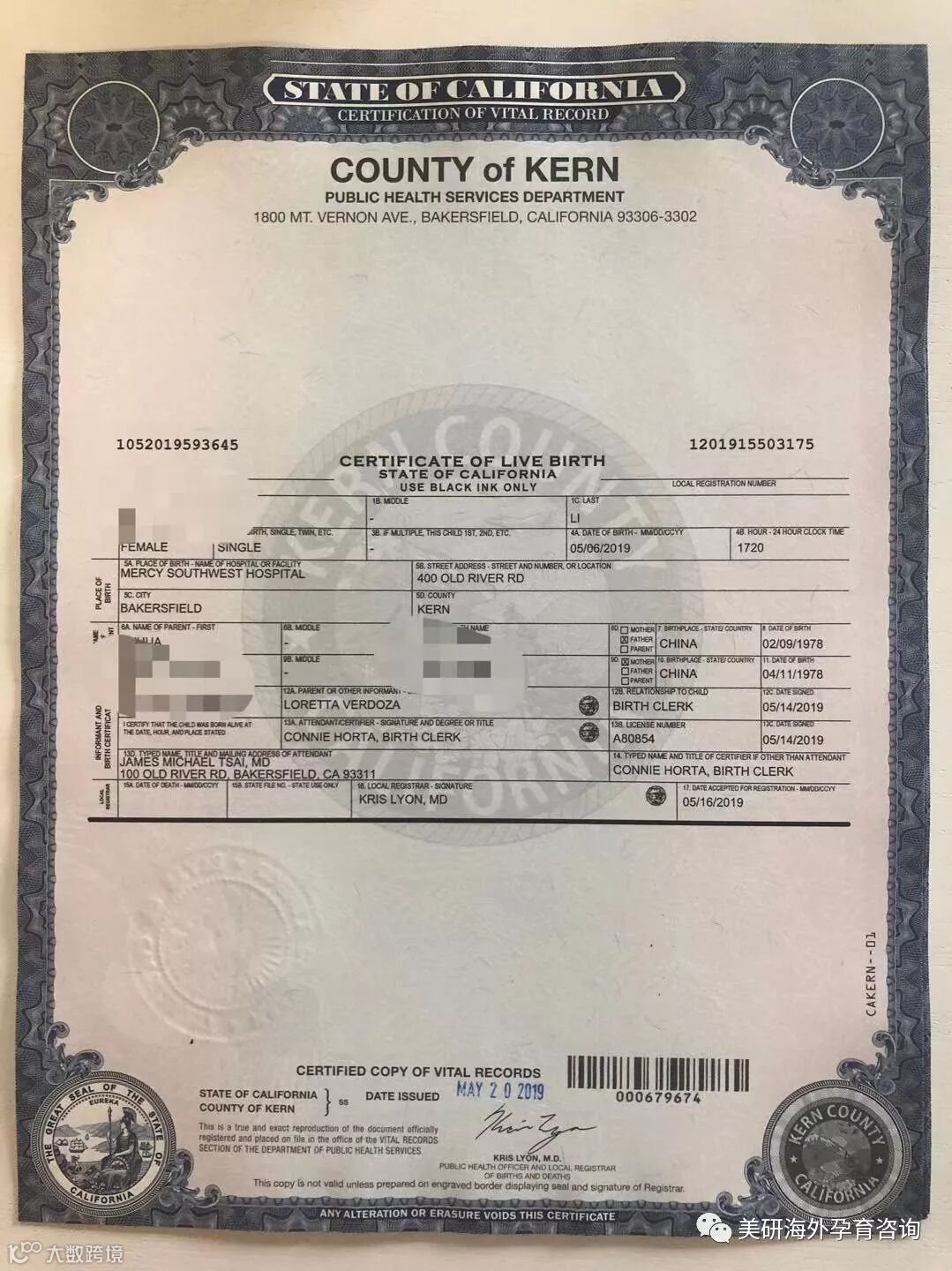 出院时,可以拿到一张临时出生纸。美国各州下面各个郡(县)政府的规则和效率不尽相同,专门赴美生子的妈妈都需要办Rush急件,加急件2-3天即可以到医院所在City的公共卫生部(Department of Public Health)领取,可以领取多份以防遗失,每份28美元。