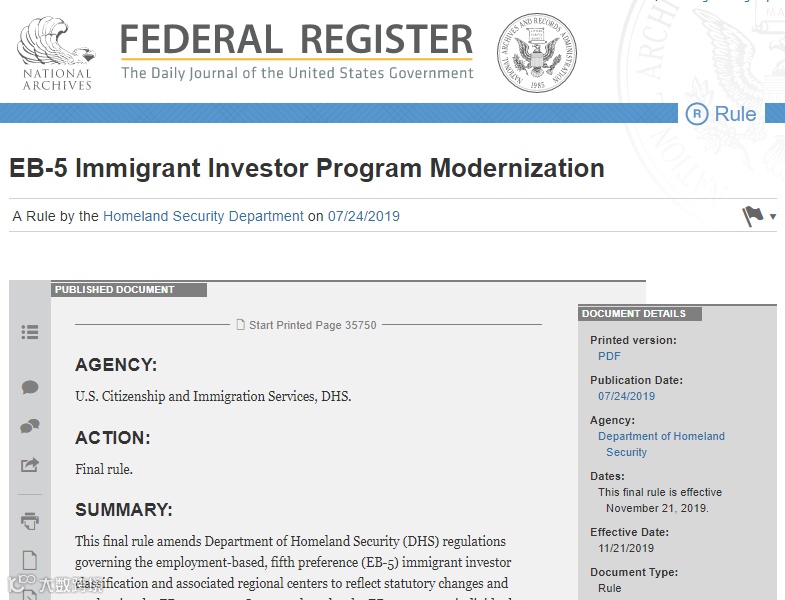 经过两年半的时间,奥巴马时代开启的EB-5移民法规修订结果于2019年7月24日正式公布,将在2019年11月12日正式生效。