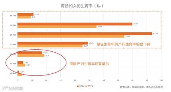 据孕龄妇女生育率数据显示,35岁~49岁的高龄女性生育率有了明显的提升,其中45岁-49岁的女性生育率増长近300%。