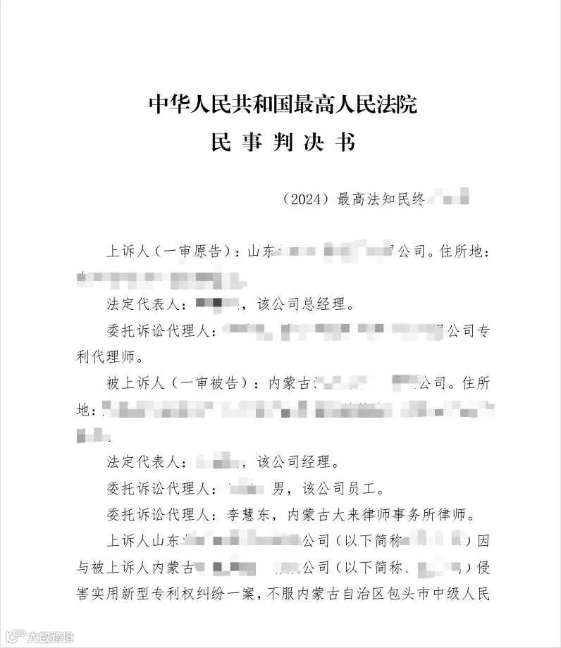 由内蒙古大来律师事务所李慧东、李志刚律师先后承办的内蒙古**化工有限公司与专利权人山东**股份公司侵害实用新型专利权纠纷案件,经包头市中级人民法院一审、最高人民法院二审,终审判决支持我方抗辩观点,驳回山东**股份公司上诉、维持原判。至此,争议双方围绕“专利权纠纷”案件的先后两案、历经三年、四次诉讼以全程序胜诉的结果,落下帷幕。